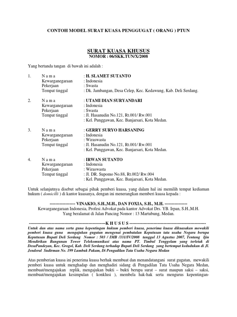 Contoh surat kuasa khusus dan gugatan tata usaha negara.